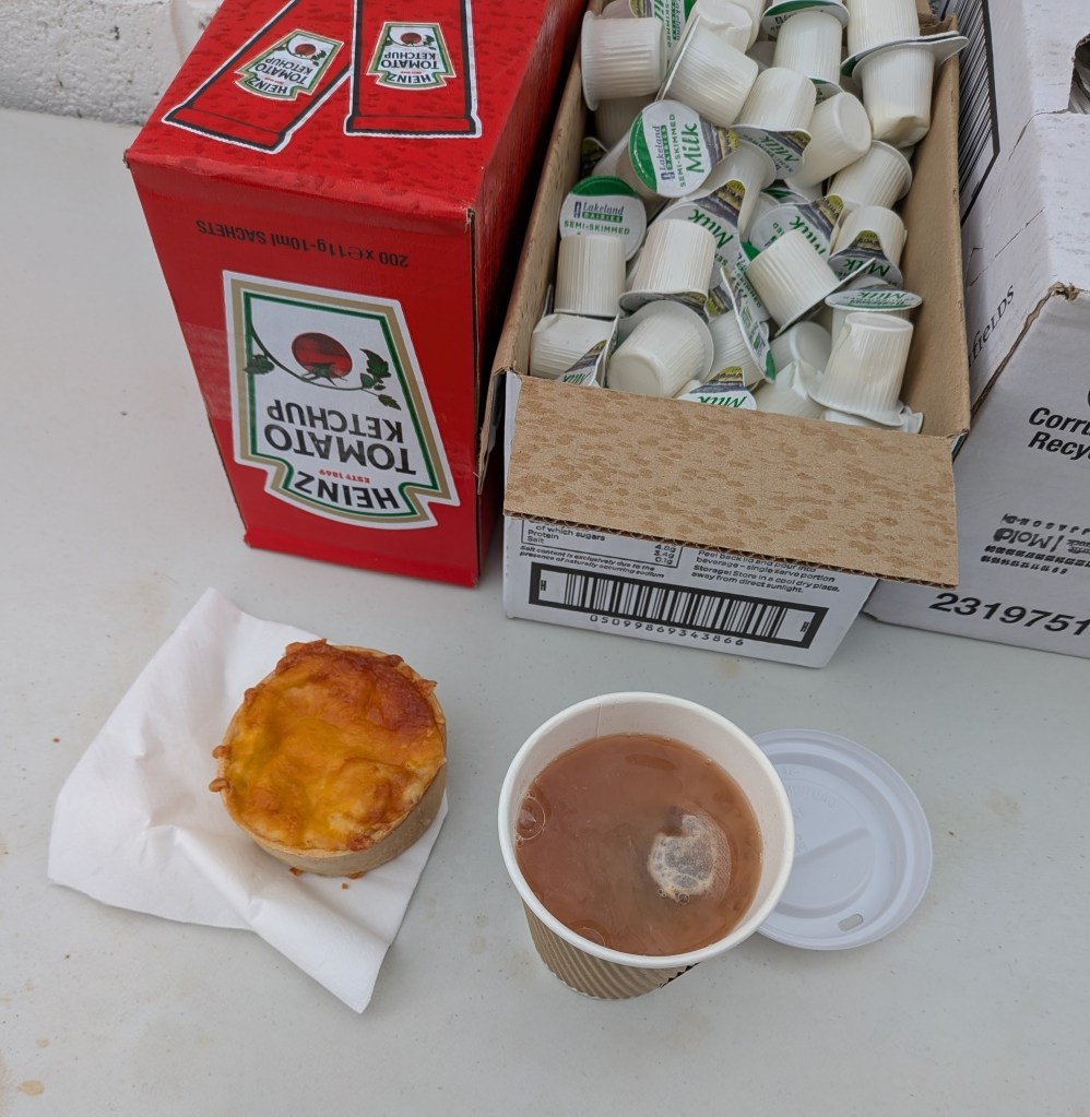 Having had a look around I was rejoined by the others and we made our way into the ground. Our first priority was some lunch and I only had one thing on my mind. The BBC Scotland game against Ayr United had included a halftime feature where the presenters tried a smokie pie. They are made using Arbroath smokies and can only be bought at the ground. I’d read online that they sell out early so I made sure to get one as soon as we were in and we went up onto the terracing to enjoy them while we watched the teams warming up. The pie was every bit as good as I’d been hoping for and I suspect it will be difficult to beat at any future grounds.