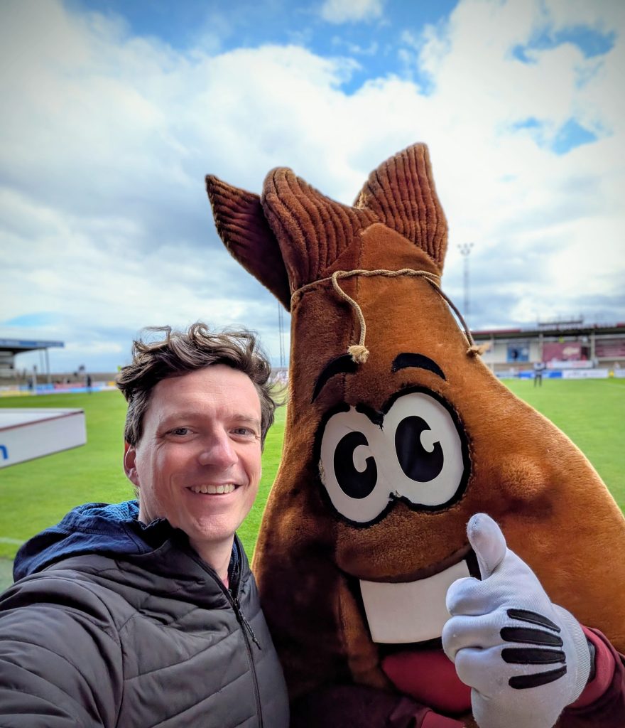 With rain starting to fall we decided to find our seats in the main stand and hope that the roof would provide us with sufficient cover. We were sat four rows back and directly behind the away dug-out. It looked to be a pretty good spot although a concrete pillar to my left meant a slightly obstructed view but neither penalty area was blocked and it seemed that it would be easy enough to see round it on both sides. As the two teams retreated back to the dressing rooms to dodge the rain and receive their last instructions before the game Smokie Joe was sent out to entertain the crowd. I couldn’t resist the opportunity and headed down to the pitch to get a photo with him.