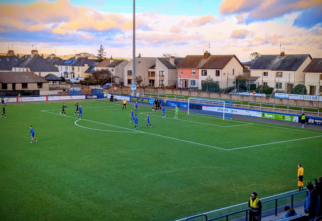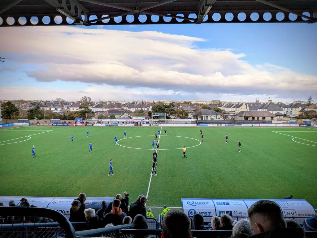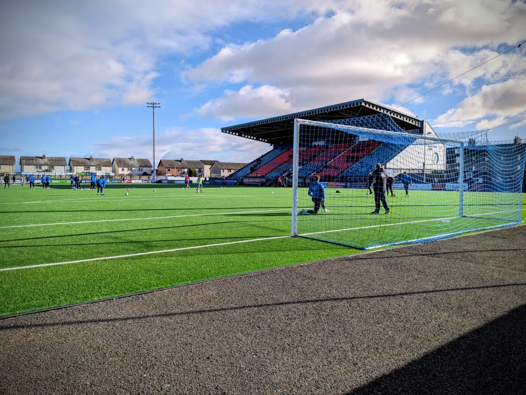 We’d arrived at the ground early and it allowed me time to find a programme and a pin badge before exploring the ground a little to get some photos. Links Park has just one stand but it’s a much more impressive structure than most grounds at this level have. It runs most of the length of the sideline on the south side of the ground and gives a great view of the pitch, the surrounding town, and the Angus hills in the distance. Behind one goal there is a low section of covered terracing and whilst taking some photos here I got my first touch of a ball while going round the 42, returning it to Montrose’s new loan goalkeeper after he had turned it round the post in warm-ups.